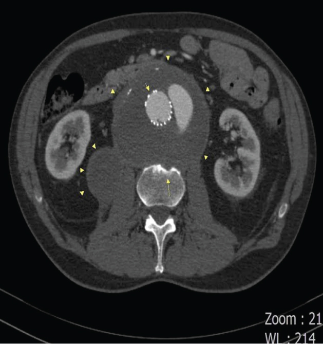 Figure 4: Axial CT image shows that chronic contained ruptured aneurysm with bilateral paravertebral hematomas (arrow heads) and also cortical erosion (long arrow) on the contact surface of this vertebras.