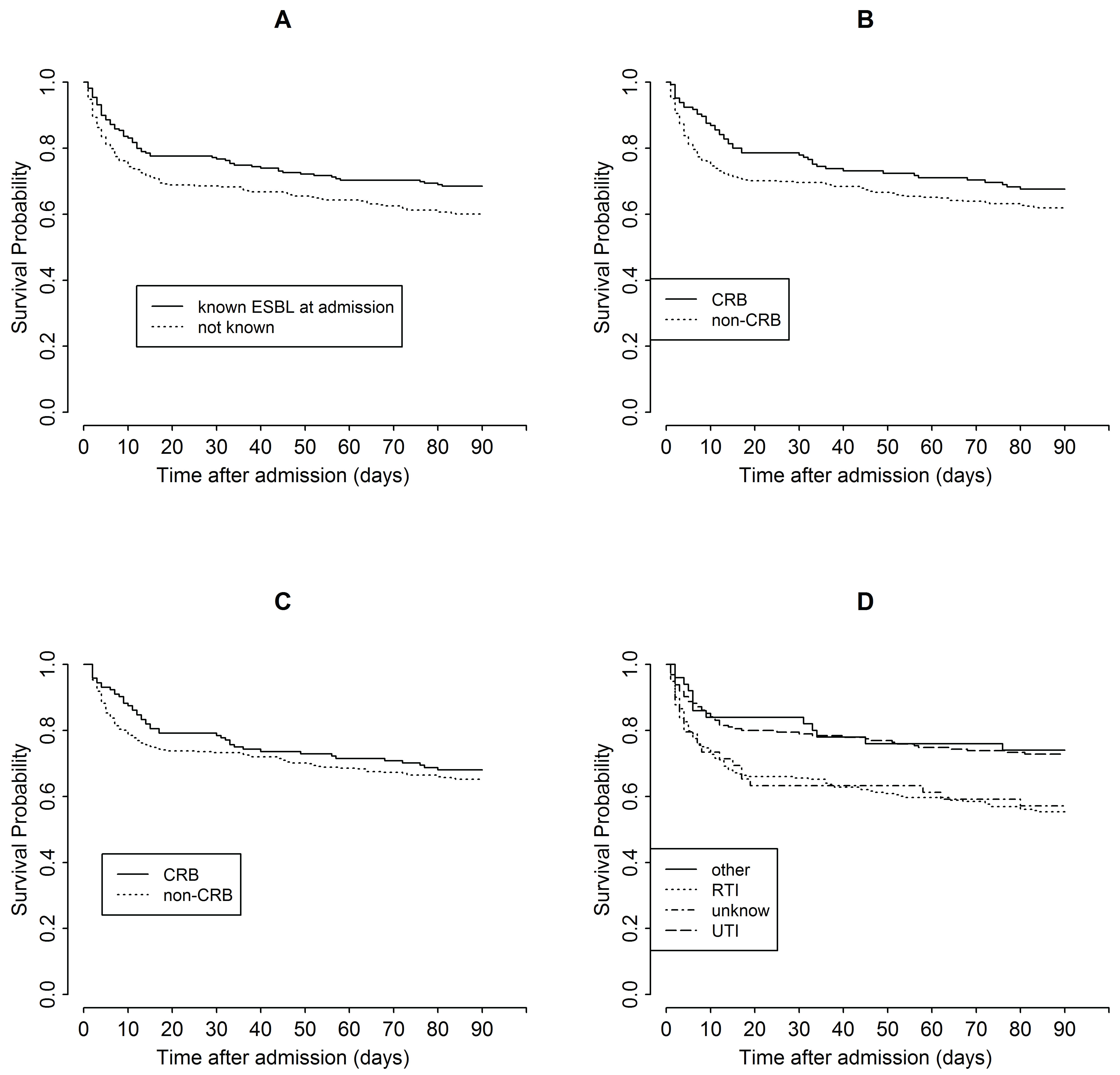 Figure 2: Estimated probability of survival in the first 90 days after admission for (A) patients known vs. not known to be already colonized with ESBL-E on admission, (B,C) patients empirically treated with carbapenem (CRB) vs. non-CRB for all patients (B) and for those who survived > 24 h (C), and (D) patients with different origins of sepsis. RTI: respiratory tract infection; UTI: urinary tract infection. View Figure 2