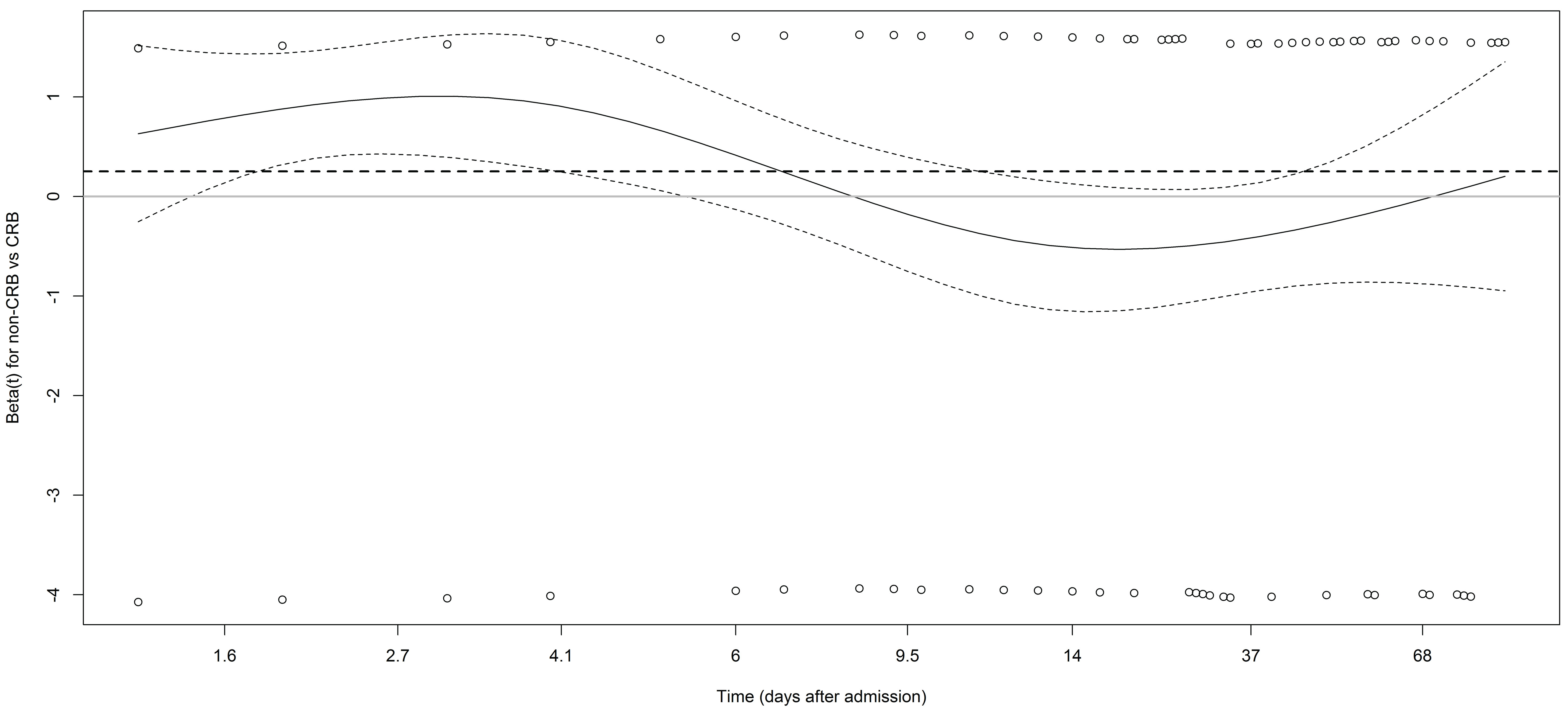 Figure 3: Plot of the estimate of β(t) (log of HR(t)) and its pointwise 95% confidence intervals used to diagnose and understand non-proportional hazards (values above 0 indicate that patients with non-carbapenem (non-CRB) have worse survival than patients treated with CRB). The dashed line represents the estimate obtained using the Cox model that assumes the proportional hazards (β = 0.25, HR = 1.29).