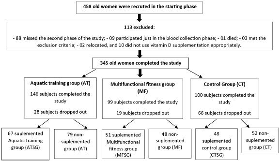 This study included 458 elderly women aged ≥ 60 years, but only 345 elderly women completed the intervention after 12 months. Of the total, 146 individuals participated in the aquatic training program (AT) and 99 participated in the multifunctional fitness program (MF) at the Social Service of Commerce (SESC), São Paulo, Brazil. This group had been performing physical activity for at least one year. Furthermore, 100 community-dwelling elderly women from community centers providing services to elderly individuals living in the same geographic area, who had not been performing any regular physical exercise for at least one year, were also included in the study as the control group (CT). The control group did not receive any information about vitamin D supplementation and physical exercises. The participants were excluded if they were receiving hormonal treatment, were on medication for weight loss, were receiving vitamin D supplementation of > 600 IU/day, and/or had a creatinine level of > 1.5 mg/dL, a total calcium level of > 10.5 mg/dL, a psychiatric disorder, and/or an acute illness that would prevent them from exercising or following the protocol. The use of antihypertensive, antidiabetic, and antilipid medications was continued during the protocol, according to the medical prescriptions.