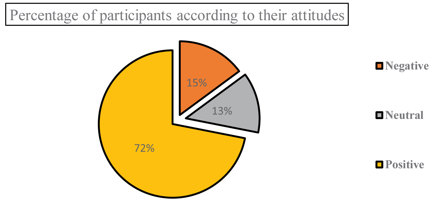 Majority of the study participants (n = 76, 69%) had a positive attitude regarding care of elderly patients, most of the responses using the Likert scale were on "agree" as per the positive opinion being explored. About 40 (36.4%) had a negative attitude regarding care of elderly patients. Their responses using the Likert scale on negative attitudes were on "agree" as per the negative opinion being ±score was 106.0 ± 4.68 with the range of 34-170 (Table 4 and Figure 2).