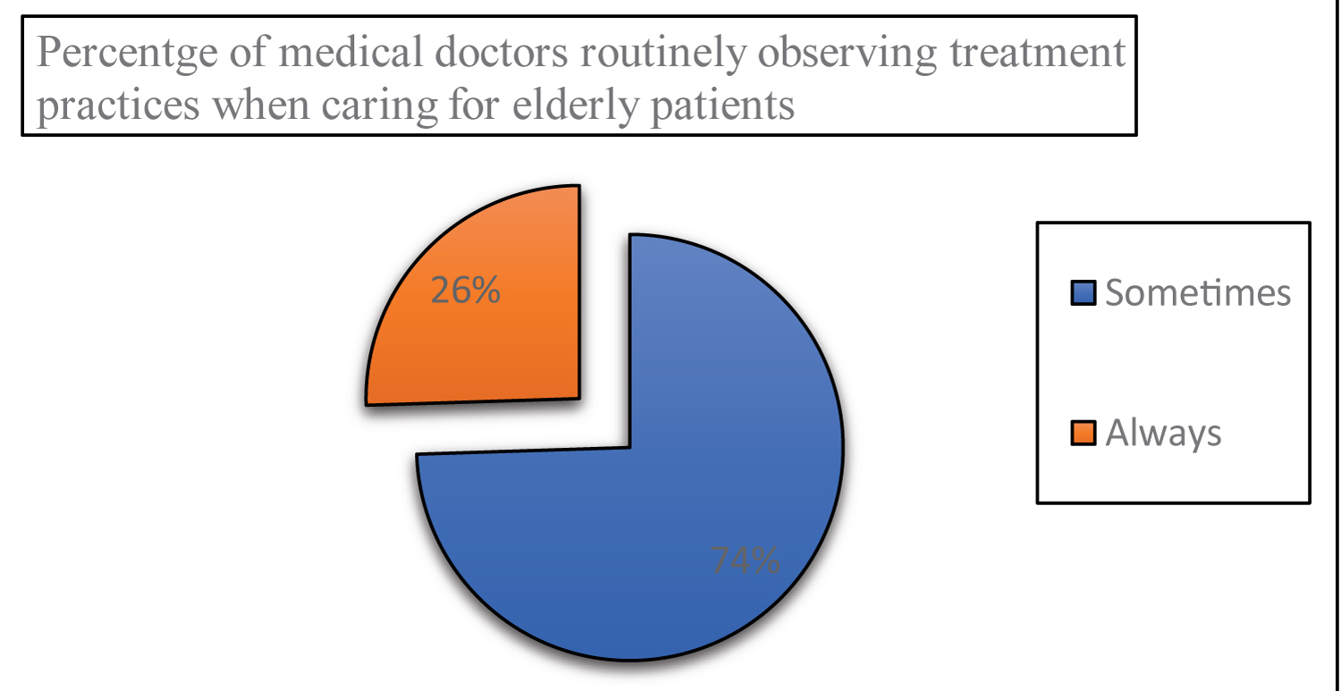 Study participants were asked a set of questions on treatment practices when caring for elderly patients. All participants who responded "Always" were considered to be routinely observing recommended treatment practices when interfacing with geriatric patients while those who responded "Sometimes" were considered not to be routinely observing treatment practices when interfacing with the geriatric patients. Majority of the study participants (n = 82, 74.5%) did not routinely observe treatment practices when caring for elderly patients. 71 (64.6%) did not routinely obtain a comprehensive health history from older patients and a majority 104 (94.6%) were not using a health assessment tool specifically designed for assessing older patients. Only a third (n = 33, 30%) routinely offered more time when interacting with elderly patients. Overall, three quarters (n = 82, 74.5%) of the study participants did not routinely observe treatment practices while one quarter (n = 28, 25.5%) routinely observed treatment practices when caring for elderly persons (Figure 3). Factors found to be significantly associated with treatment practices of medical doctors when caring for elderly persons were advanced educational level (aPR: 1.31; 95% CI: (1.17-1.44; p = 0.001, aPR: 1.32; 95%CI: (1.07-1.61; p = 0.001 and hospital affiliation in a specialized hospital (aPR: 1.19; 95% CI: (1.05-1.35; p = 0.05 Table 5).