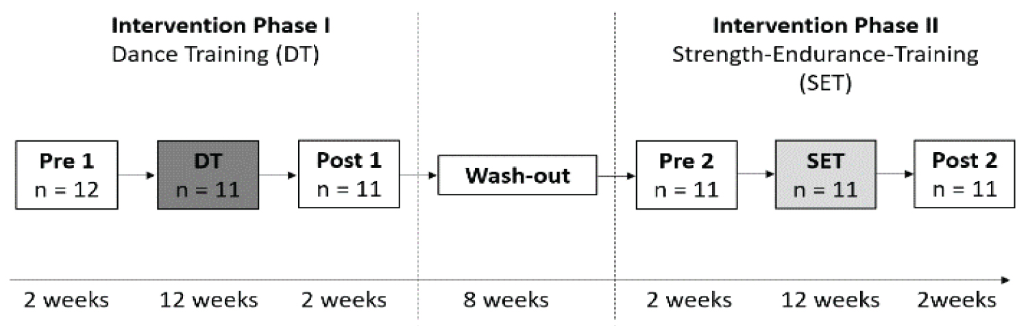 An Intervention study in a pre- post-test design has been chosen, which was split into two phases: Intervention phase I = Dance Training (DT) and Intervention phase II = Strength-Endurance Training (SET) (Figure 1). Eleven dementia patients (81.82 ± 4.51 years) participated in the intervention study. The demented patients, selected by the cooperating care station (VITANAS in Magdeburg, Germany) attend both intervention phases, each lasting twice a week, 60 minutes for 12 weeks. Before each intervention started, pre-test data was collected. The post-test assessments were conducted before the wash-out period (eight weeks inactivity) and after intervention phase II. The wash-out phase served to ensure that any training effect from the first intervention did not influence the impact of the second intervention. All participants have been hospitalized for more than one year and have had different forms of the disease. The Mini-Mental-State Examination was used to determine the severity of dementia. The results showed that one subject had mild dementia and nine had moderate dementia and one subject had severe dementia. Participants had to be physically and cognitively able to perform an exercise program and follow the instructions of the exercise instructor.
