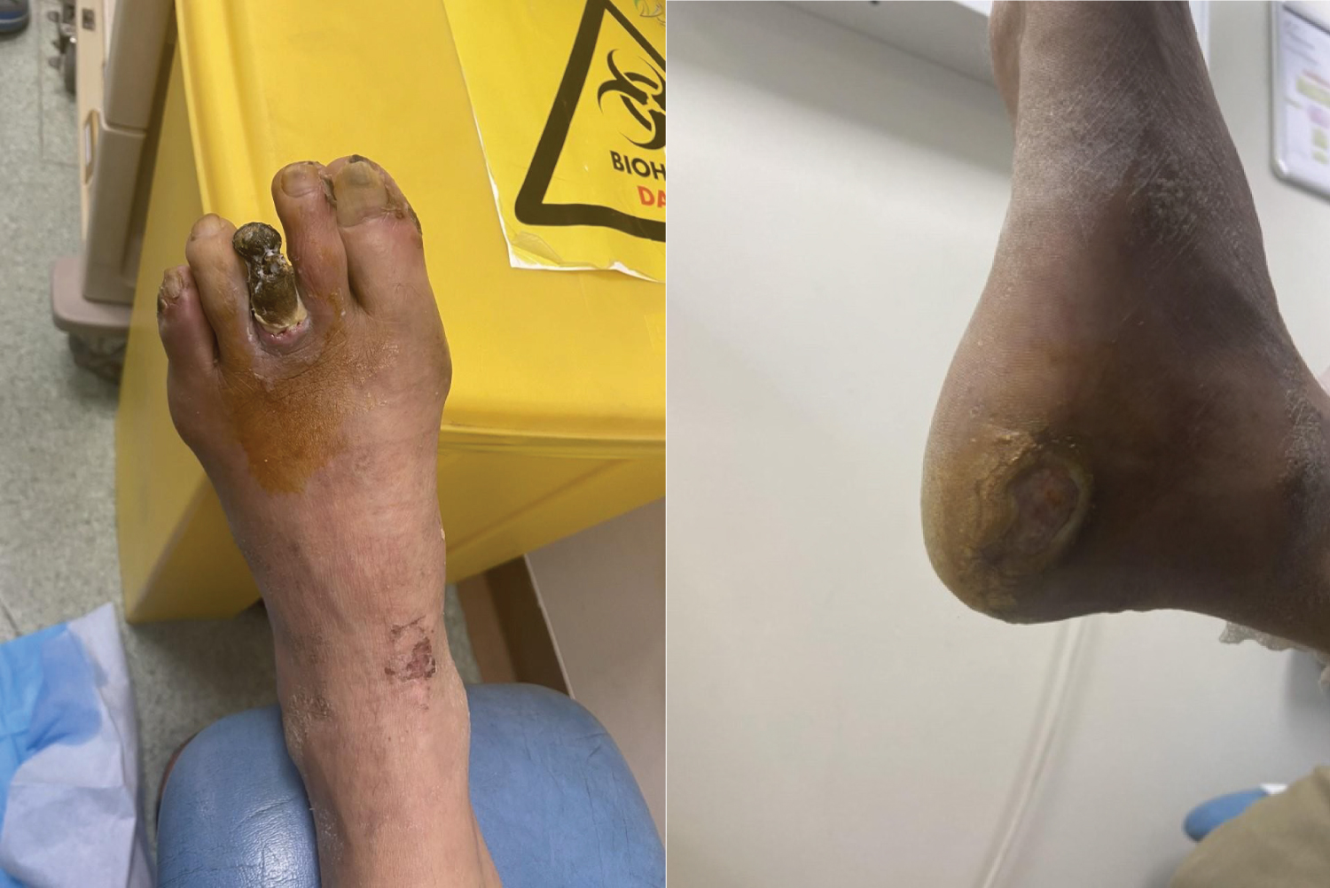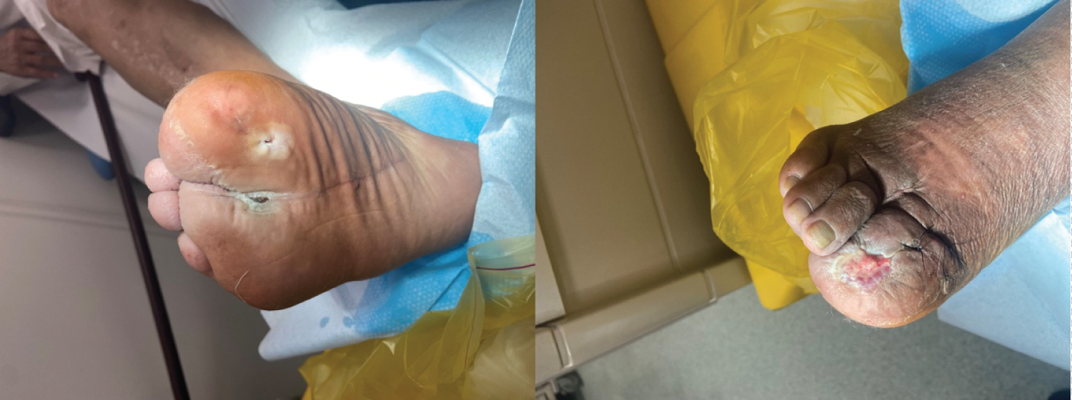 He lives with his family and smokes two packs per day but does not drink alcohol or use recreational products. He did not attend his three-month routine appointments at the diabetic clinic, nor performed his regular blood investigations (HbA1c, renal and liver function tests). Table 1 shows the patient's pertinent laboratory findings. The patient has no record of neither diabetes retinal screening nor regular foot care treatment March 2021 attended the health center for diabetic foot wound dressing care and review. Upon examination both feet had signs of advanced diabetic foot complications such as no arterial perfusion, absent dorsalis pedis and loss of vibration and touch sensation (Figure 1).