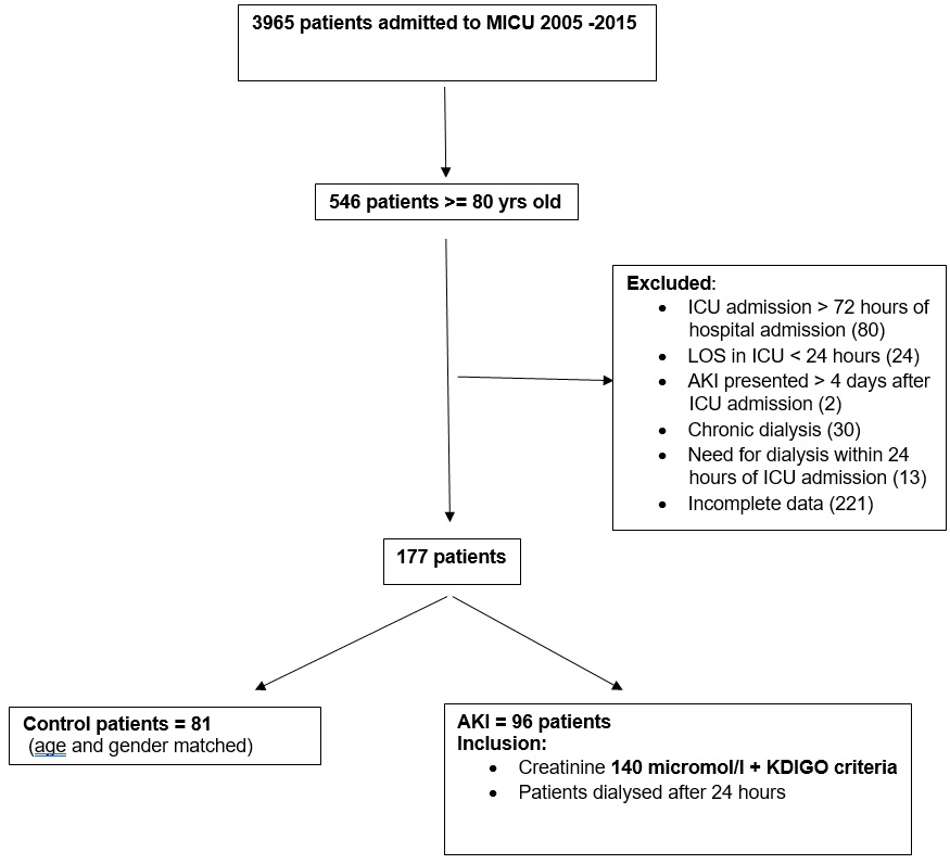 During the period 2005 - 2015, 546 (14.2%) out of the 3965 patients admitted to the MICU were 80 years or older (VOP). Of these, 96 (17.6%) fulfilled the inclusion criteria for this study (Figure 1). Of note, 23 patients with AKI who were admitted to ICU for less than 24 hours, and were therefore excluded from the study group, 18 (78%) died during their ICU admission. Also, of the 13 patients who were dialysed during the first 24 hours of admission, 6 (46%) died in ICU and the remaining 7 patients were weaned from dialysis in ICU and survived till hospital discharge.