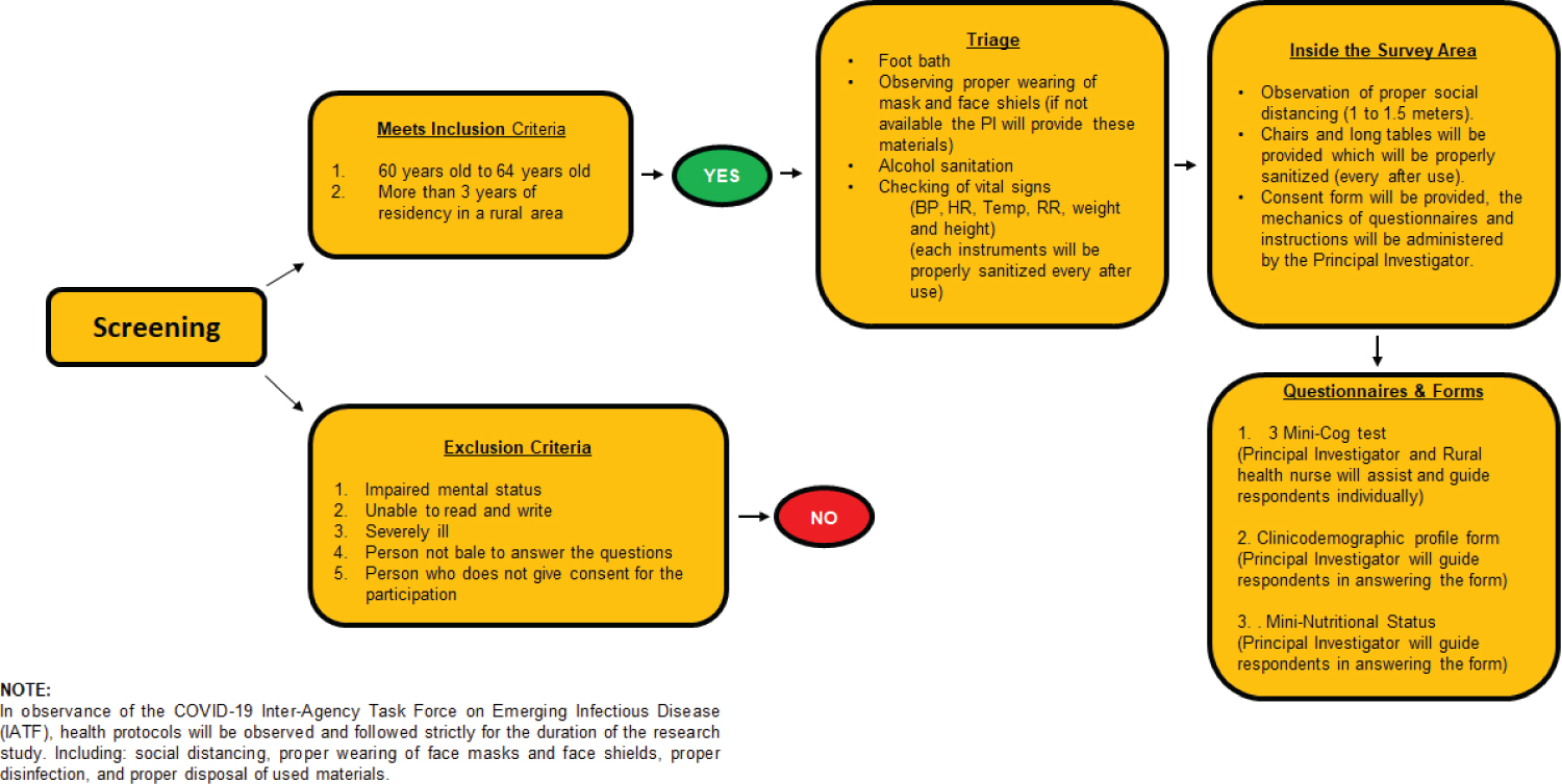 A screening area outside the barangay health unit is provided. Before proceeding to the triage, respondents were screened. If the respondent has one of the exclusion criteria, they will not proceed to the next step. But they will have a separate check-up to address any health concerns, as referred by the Principal Investigator to the rural health medical officer. If the respondents meet the inclusion criteria, they can proceed to the next step. These respondents underwent triage by two (2) barangay health workers. First, foot bath. Second, sanitation process (hand hygiene necessities and checking of proper wearing of face mask and face shield). And last, checking of vital signs (blood pressure, heart rate, temperature, respiratory rate, body weight in kilograms, and height in centimeters). The following apparatus were provided and used - one (1) blood pressure monitor, one (1) infrared forehead thermal scanner, one (1) stethoscope, two (2) tape measures, one (1) weighing scale, one (1) pulse oximeter, and one (1) UV sterilizing box. After use, adequate sanitation was applied using sanitation materials such as alcohol and alcohol wipes. In case of incomplete protective gears, the Principal Investigator provided free necessary materials.