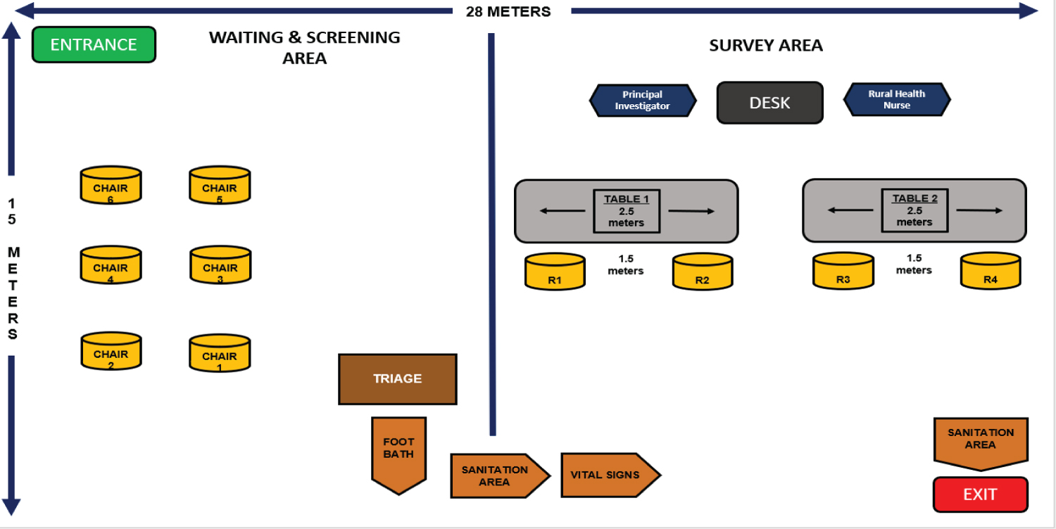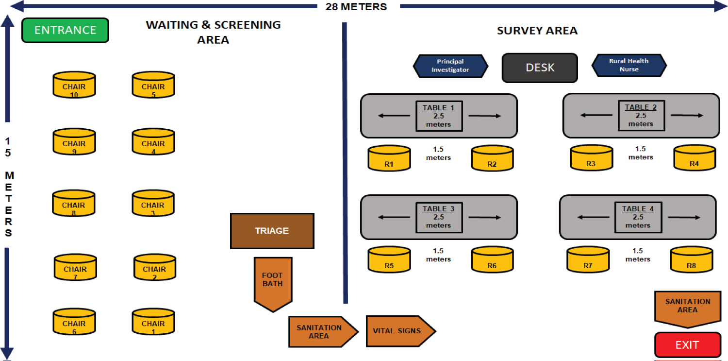 An approximately 28 meters by 15 meters open area (half basketball court), outside the rural health unit is provided. It is an open and well-ventilated area covered by tent. Half of this is allotted for the survey area, and the other half will act as a waiting area for the respondents. The number of people that can be accommodated in the survey area following the social distancing protocol is 10 (8 of which are respondents, 1 rural health unit nurse, and the principal investigator), while approximately 8 to 10 respondents will be at the waiting area (with proper social distancing).