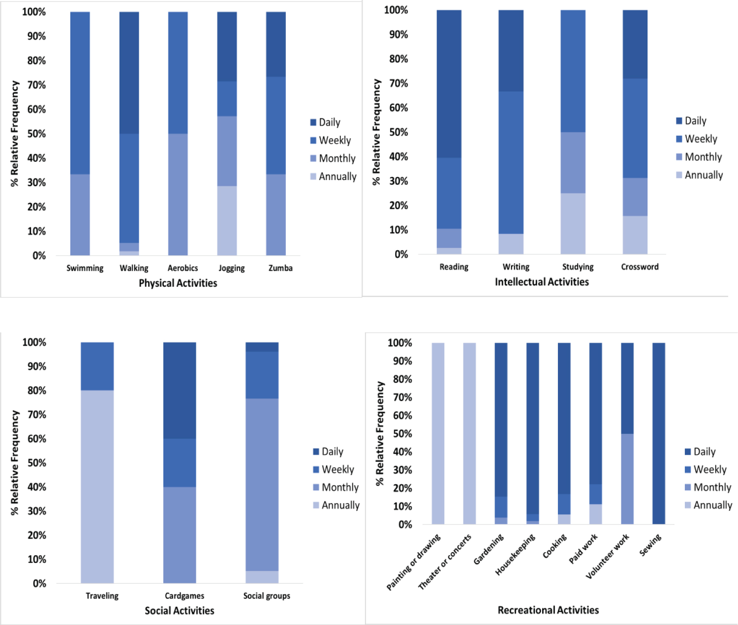 The next most participated in activity was mental, with 84 (100%) the geriatric sample taking part in one or more of this type of pursuit, with the most prevalent mental activities being reading at (38/84 or 45 %) doing crossword at (32/84 or 38%). Majority of the senior group, 79 (75%) participated in some form physical activity, with walking (58%) being the most prevalent activity followed by dancing classes in the form of Zumba (15%).