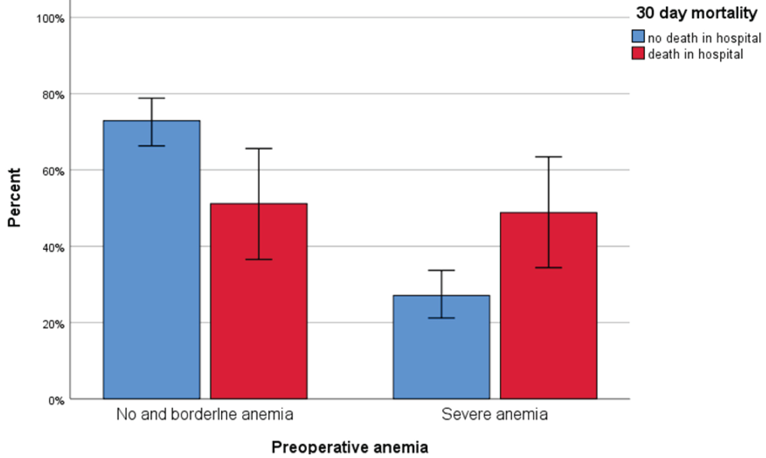 Figure 1: 30 day mortality for all three groups of pre-operative anaemia (Error bars 95% CI).