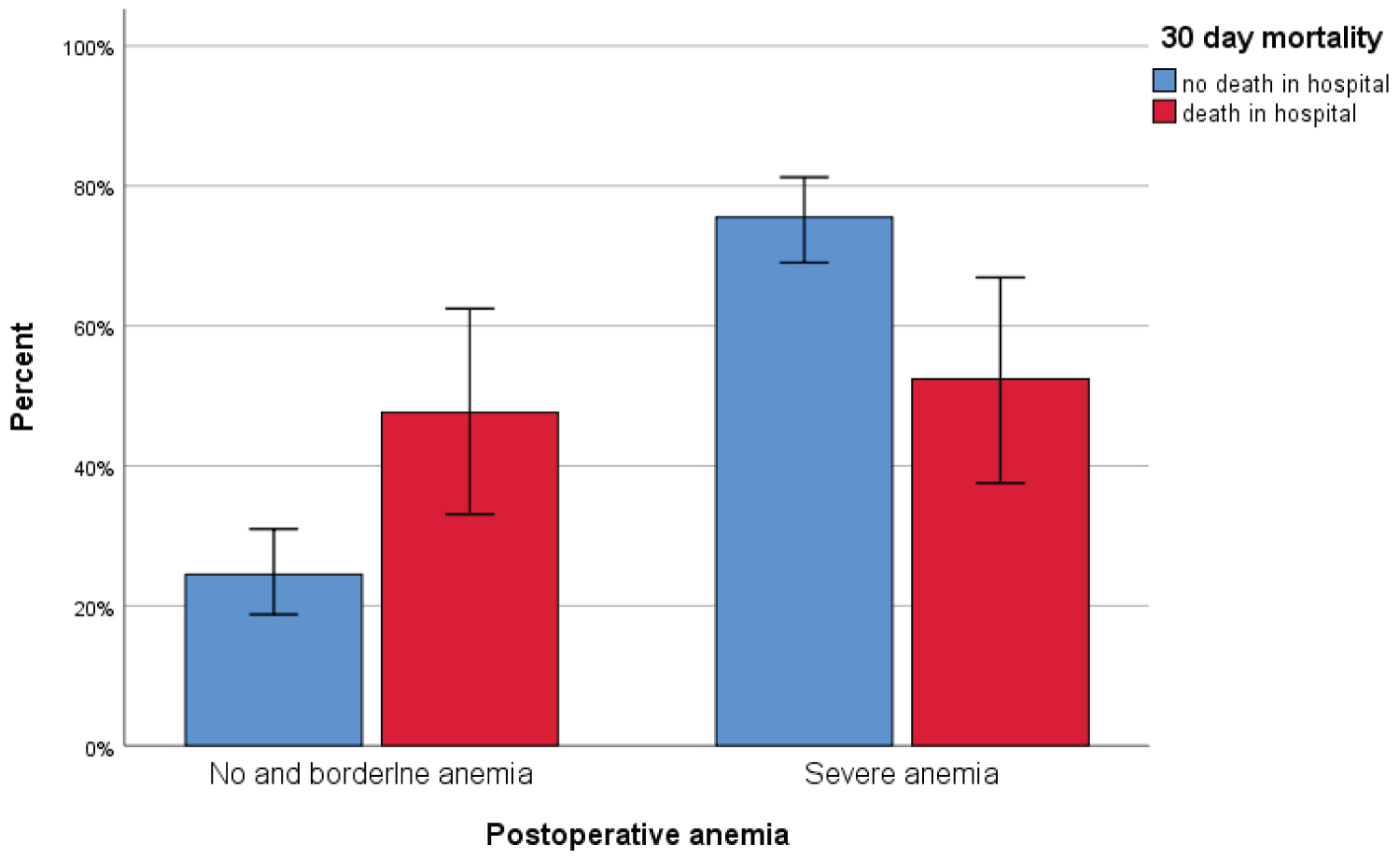 Figure 2: 30 day mortality for all three groups of post-operative anaemia (Error bars 95% CI).