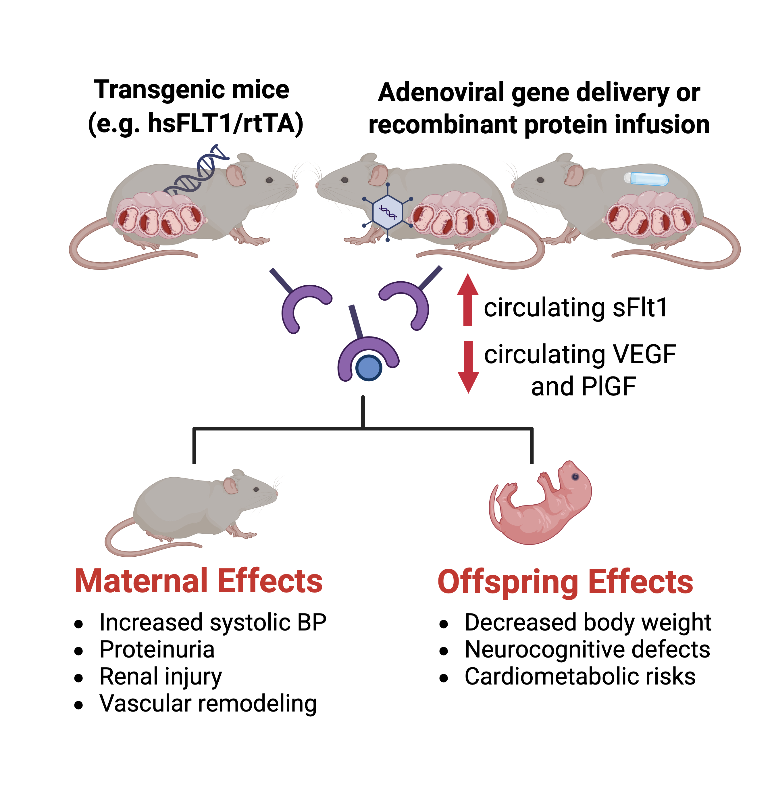 sFlt1 can be overexpressed by transgenic approaches or by systemic infusion of viral vectors targeting maternal tissues or sFlt1 recombinant protein. This leads to increased circulating sFlt1 and decreased circulating VEGF and PlGF. This model recapitulates maternal and offspring effects seen in humans. (Created with Bio render).