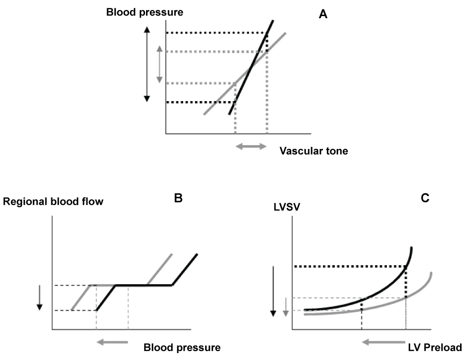 Panel A: Vasoreactivity is increased in hypertensive patients (in black) when compared to normotensive patients (in grey). Small vascular tone variation induces drastic change in blood pressure in hypertensive paptient, so that blood pressure may either increase or decrease abruptly. Panel B: Baroreflex resetting in hypertensive patient results in shifting blood flow regulation to major organs (brain, heart) to higher blood pressure levels. Therefore, a decrease in blood pressure may result in a decrease in organ blood flow in hypertensive patient, when it is maintained in normotensive patient for the same level of blood pressure. Panel C: Left ventricle (LV) hypertrophy is an adaptation to chronic high blood pressure and LV afterload. Conversely, LV hypertrophy induces a decrease in LV relaxation and exposes the LV to steep reduction in preload even for small reduction in volemia or venous return. A fall in LV stroke volume (LVSV) may then occur with a fall in blood pressure. View Figure 1