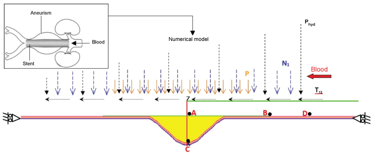 Different numerical methods were used for modeling the full stenting system, consisting of the stent, aorta, atheroma, and blood flow. The geometry of the whole system is shown in figure 1. The atherosclerotic plaque, the endoprosthes is wall, and the aorta wall are considered to be deformable. The aneurysmal aorta is of 60 mm diameter. The atherosclerotic plaque is situated just between the endograft and aneurysm wall.