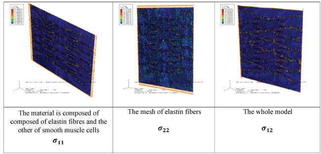 We used finite element code ABAQUS to perform the numerical simulation using 2D element formulation. To study the media layer, we consider two similar plates with the same section and two different materials; one is composed of elastin fibers and the other of smooth muscle cells and collagen fibers. We supposed a condition of adhesion between the two plates since the friction conditions are not known between them. All the materials were considered as elastic isotropic material. The problem was described with a kinematic approach. We performed numerical tests, i.e. a tensile test in the directions 1 & 2 and a shear test. We imposed a deformation of ε = 0.05 at the boundary of the plate. The numerical simulation of each mechanical test allows us to calculate the state of stress.