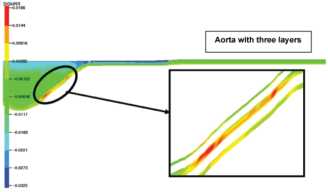 We evaluated the stresses distribution in the aorta composed of three layers (Figure 3). The results were then compared with those of only one layer. The radial stresses were symmetric with respect to the axis o-z. The maximal radial stresses (19500 Pa) were found in the aneurysmal sac; however, these values were highly different comparing with stresses values in the aorta composed only of one layer (11100 Pa). Also, the distribution of these stresses was different between the two cases. In the aorta with three layers, they were particularly concentrated in the media layer.