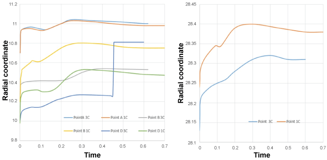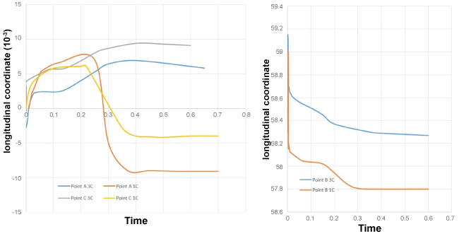 Figure 6: Point's positions (A, B, C) in the aorta with one (1C) and three layers (3C)/longitudinal coordinate.