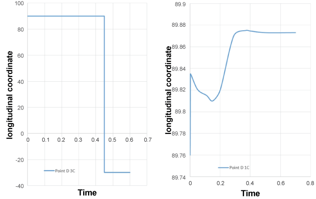 Figure 7: Point D position in the aorta with one (1C) and three layers (3C)/longitudinal coordinate.