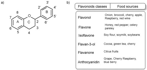 Figure 1: a) Basic structure of the flavonoids; b) Flavonoids classes and food sources of flavonoids.