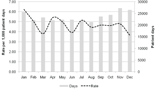 The overall incidence density was 4.8 cases per 1,000 patient days. The rate remained stable throughout the study period and did not show any statistically significant change in trend (R-square = 0.12 and p value = 0.093). No seasonal variation was detected in the rates, as indicated in figure 1. Though the rate decreased in March, June and December, but this was statistically insignificant. Hypothetically, the decrease in March could be attributed to admission of patients with Middle Eastern Respiratory Syndrome (MERS) corona virus, the decrease in June could be due to preceding hand hygiene campaign in May and infection control link nurse program while the lower rate in December could be due to the preparation for mock survey for accreditation. During all these three points, the infection control activities and compliance to practices was increased, hence could have resulted in decreased rates.