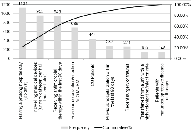 The most common risk factors were prolonged stay (≥ 5 days) n = 1134 (85.5%), indwelling medical devices 955 (72%), antimicrobial therapy in past 90 days 949 (71.5%) and previous colonization/infection of MDRO 689 (52%). The pareto analysis, in figure 2, indicated that controlling these factors might help in reducing the MDRO incidence rate by approximately 80%.