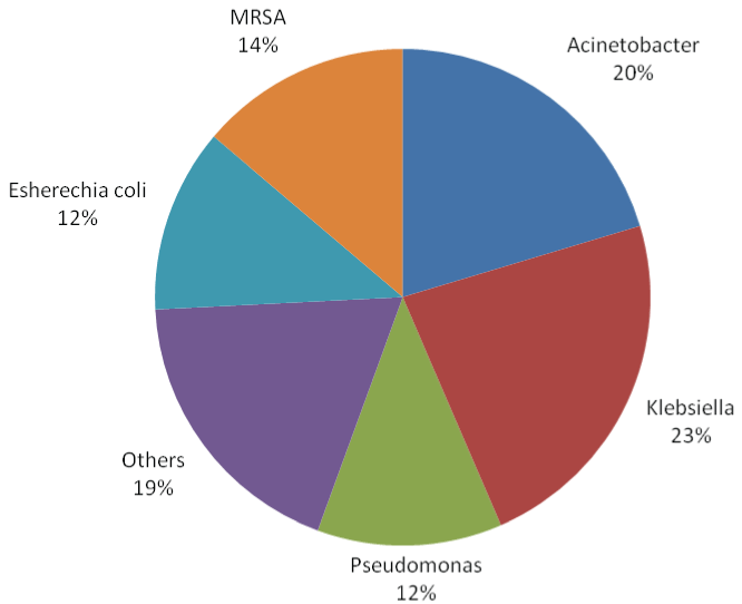 The most common organisms were gram negative (1090, 82.2%). Among all the hospital acquired MDROs K. pneumoniae (307, 23%), A. baumannii (270, 20%), MRSA (183, 14%), P. aeruginosa (160, 12%) and E. coli (159, 12%) were the most prominent pathogens (Figure 3).