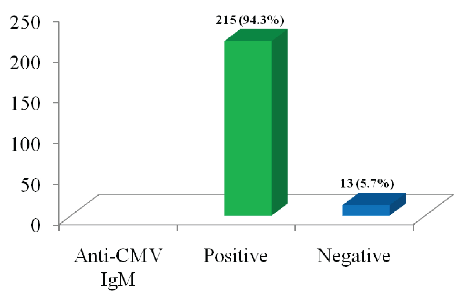 All patients’ sera were tested for anti-CMV IgM using commercially available ELISA kits (Diagnostic Automation, USA). The procedure was carried out according to manufacturer’s instructions. Briefly, 1:40 dilutions were prepared by adding 5 μL of the test samples, negative control, positive control, and calibrators to 200 µL of sample diluent. It was mixed well. Hundred microliter (100 μL) of diluted sera, calibrator, and controls were dispensed into appropriate wells. Hundred microliter (100 μL) of sample diluent was added to the reagent blank well. The plate was incubated at room temperature for 30 minutes. The liquid was removed from all wells by decanting. This was followed by washing the wells with washing buffer and the washing was repeated three times. Hundred microliter (100 μL) of enzyme conjugate was added to each well and incubated for 30 minutes at room temperature. Enzyme conjugate was removed from all wells by decanting and washing was repeated three times with washing buffer. Hundred microliter (100 μL) of tetramethylbenzidine (TMB) chromogenic substrate was added to each well and incubated for 15 minutes at room temperature. This was followed by adding 100 μL of stop solution to stop the reaction. The optical density of each well was read at 450 nm with a microwell reader and interpreted. Samples having CMV G index ≥ 1 were considered positive while those with CMV G index ≤ 0.9 were considered negative.