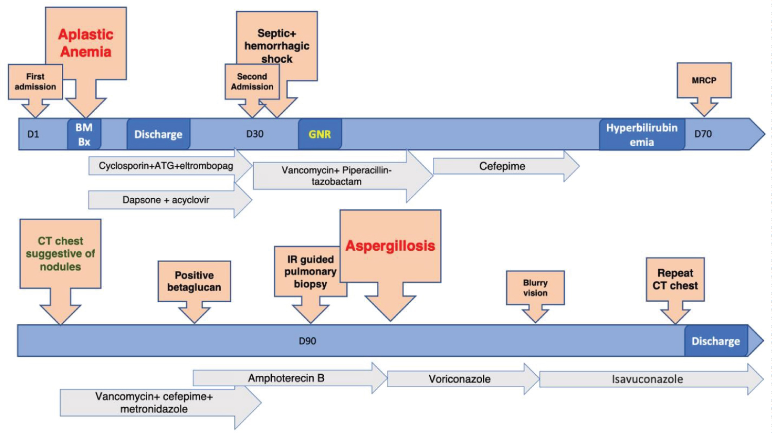Confirmatory tissue diagnosis was required to differentiate between benign versus malignant cause of pulmonary nodules which was challenging due to persistently low platelet count around 10,000/uL and patient requiring transfusions daily. Patient was given multiple platelet transfusions to increase platelet count to greater than 50,000/uL and CT guided core biopsies of one of pulmonary nodules was performed. Pathologic examination of tissue specimen established diagnosis of aspergillosis (Figure 2A, Figure 2B, Figure 2C and Figure 2D). Patient was initially treated with amphotericin B which de-escalated to voriconazole after confirmatory tissue diagnosis. It was later on switched to isavuconazole due to blurry vision. Timeline of our patient is shown in Figure 3.