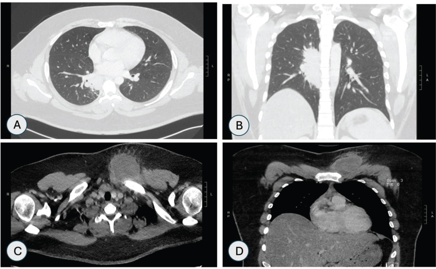Figure 4: CT Chest-Lung window (A & B) Axial and coronal views showing right retrohilar mass measuring 2.3 × 3.6 × 7.7 cm focally obstructing the bronchus serving the basal medial right lower lobe. CT chest-bone window; (C & D) Axial and coronal views showing lucencies in head of the left clavicle with anterior subcutaneous fluid collection with rim enhancement.