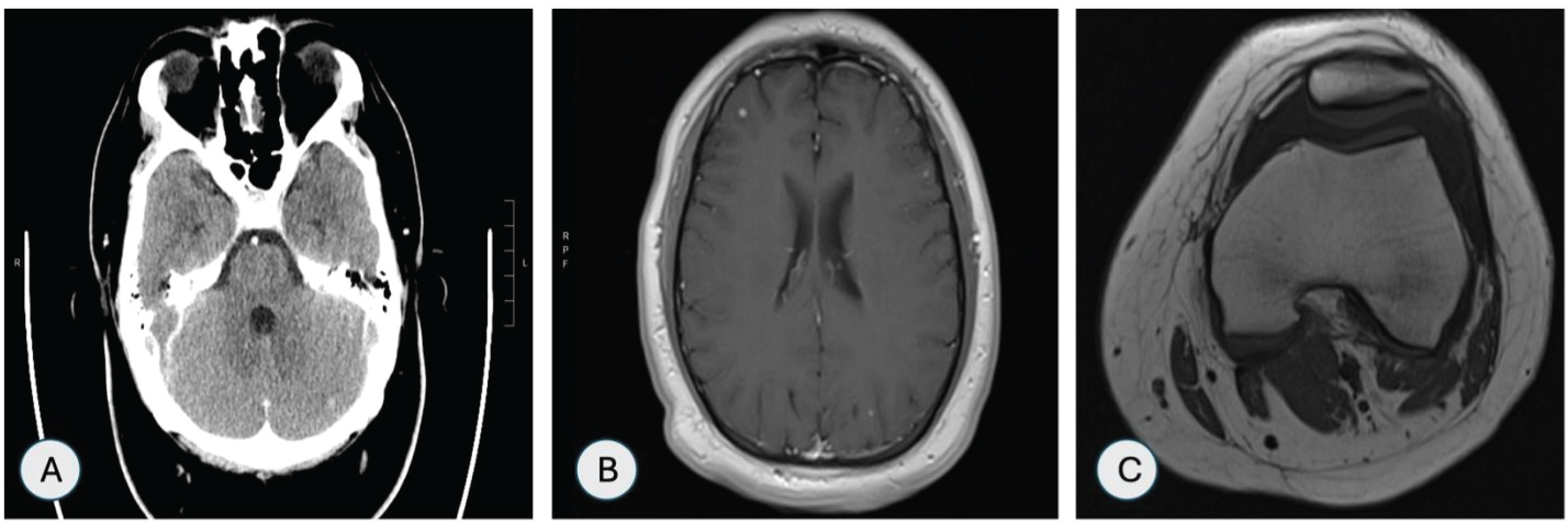 Figure 5: (A) CT head showing 5 mm enhancing lesion in left cerebeller hemisphere; (B) MRI head showing multiple enhancing foci in bilateral cerebral hemispheres; (C) MRI left knee showing large suprapateller effusion.