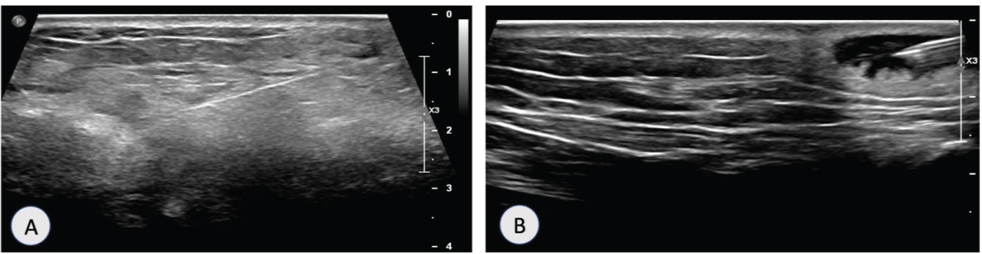 Figure 6: (A) Ultrasound guided biopsy of left breast lesion; (B) Ultrasound guided biopsy of right wrist lesion.