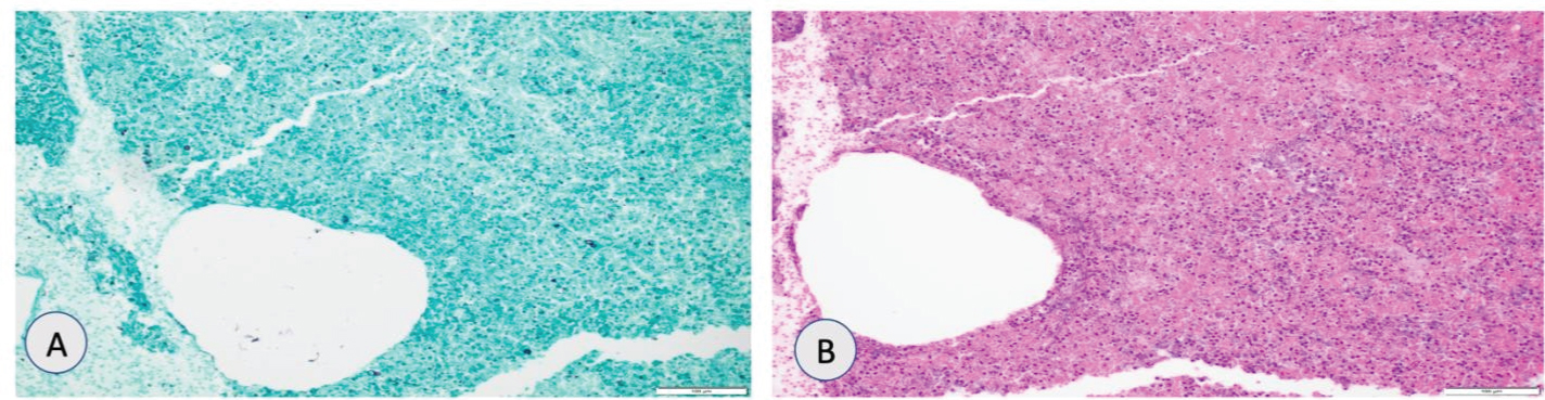 Figure 7: (A) Grocott methenamine silver (GMS) showing rounded yeast forms with broad-based budding suggestive of blastomycoses; (B) Hematoxylin and eosing (H&E) stain showing extensive necroinflammatory debris.