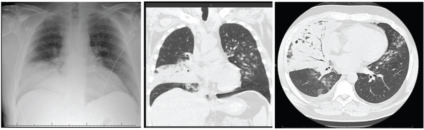 During this admission, CXR was suggestive of consolidation in the right middle lobe as shown in Figure 8A.
