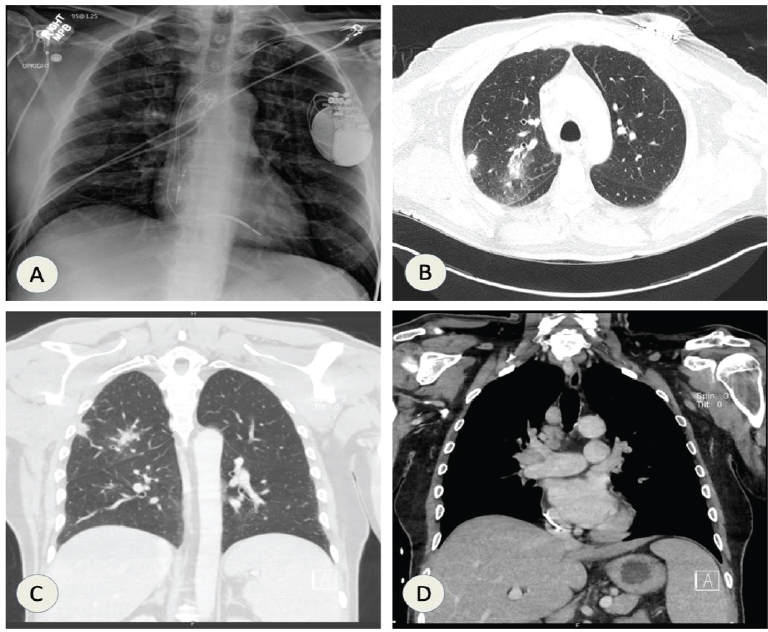 Figure 1: A) Chest X-ray (CXR) shows left sided pleural effusion; B) CXR post left sided chest tube placement; C) Computerized tomography (CT) chest showing right medial upper lobe nodule; D) CT chest showing right subpleural based nodule.
