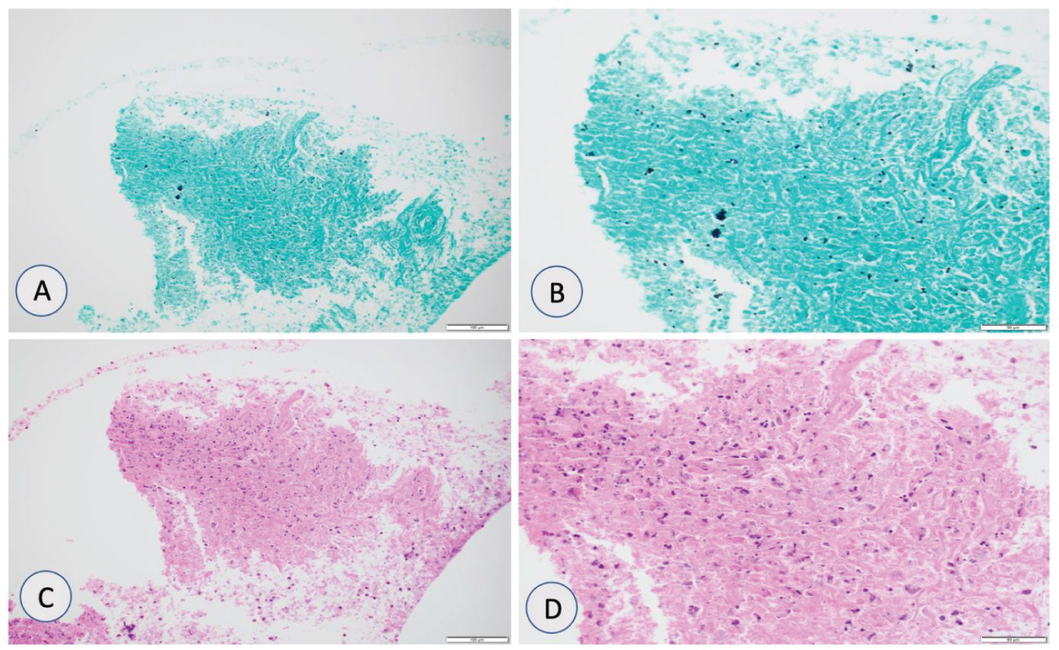 Figure 11: (A & B) Grocott methenamine silver (GMS) stain showing budding yeast suggestive of histoplasmosis species at 20x and 40x magnification; (C & D) Hematoxylin and eosin (H&E) stain showing necroinflammatory debris at 20x and 40x magnification.