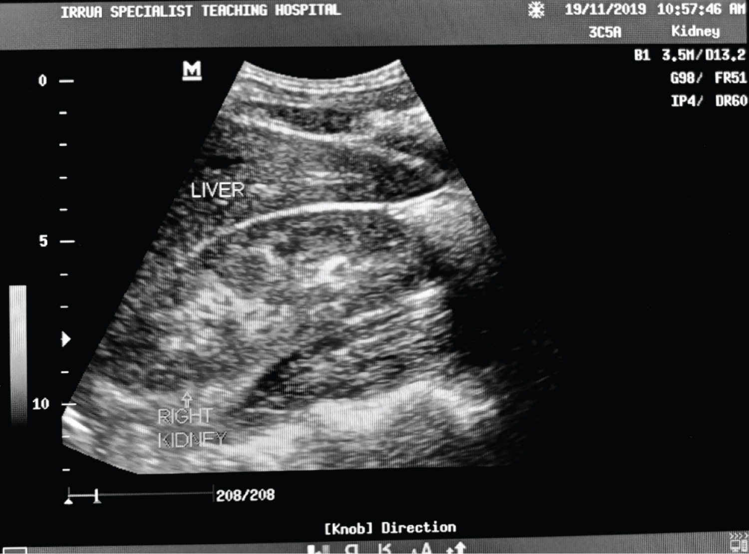 Figure 6: Ultrasound of the abdomen showing longitudinal sections of the right kidney with its echogenicity greater than that of the liver and preserved cortical-medullary differentiation (Grade 2 renal cortical echogenicity) in a Lassa fever patient with reduced cortical thickness and serum creatinine level 2.3 mg/dl.