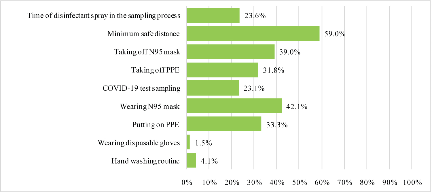 Students who volunteered were assessed for the following knowledge of infection control: the six steps of standard hand washing, how to wear clean gloves, how to wear personal protective equipment, how to use N95 masks, how to collect specimens, how to take off gloves, how to take off PPE, how to take off PPE on a general level, how to use disinfecting spray on surfaces, and the minimum safe distance. Each process was divided into steps and 1 point was awarded for each correct step.