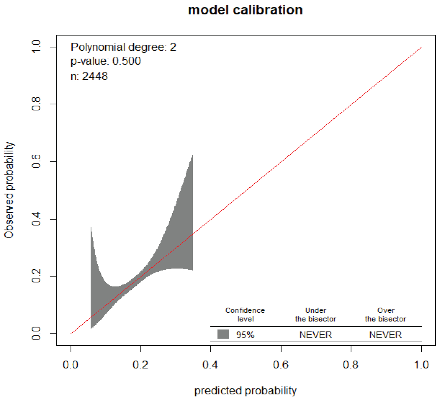 The AUC of the final original reduced model was 55.3% (95% confidence interval: 0.522-0.582). The calibration performance (fit of observed to expected risk a cross all individuals) assessed by the calibration belt using “givitiR Standardization Belt” in R programming had a p-value of 0.50 (Figure 1).