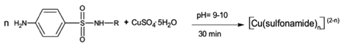 These complexes were synthesized with the sulfonamide ligands shown in figure 1. The general synthesis method, represented in figure 2, is by mixing 2:1 sodium sulfonamide (pH = 9-10):CuSO4⋅5H2O. After stirring the precipitate formed was filtered, washed with water, dried at room temperature and protected from light.
