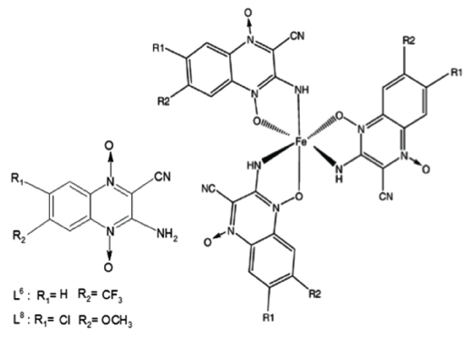 Also, two novel iron complexes, [Fe(L-H)3], with 3- aminoquinoxaline-2-carbonitrile N1,N4-dioxide derivatives (L) as ligands (patent of invention PI0902923-0, 2009, Brazil) showed in vitro growth inhibitory activity on Mycobacterium tuberculosis H37Rv (ATCC 27294), together with very low unspecific cytotoxicity on eukaryotic cells (cultured murine cell line J774)] [38]. These complexes were synthesized in methanolic solution of Fe(III):ligands (1:2) and reacted under reflux many hours. The MIC values of both complexes were 0.78 μg mL-1 and for the free ligands were 3.9 for L8 and 6.2 for L6 (Table 2).
