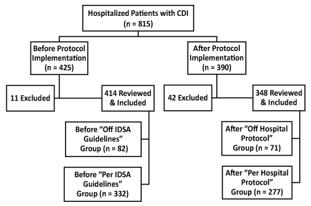 A retrospective, nonrandomized, pre-and-post quasi-experimental study of patients between the ages of 18 and 89 years with a primary or secondary diagnosis of intestinal infection due to C. difficile from November 1, 2013 to January 31, 2016 was conducted in a 443-bed tertiary care county teaching hospital located in west Texas. November 1, 2013 to October 31, 2014 served as the pre-protocol implementation group and March 1, 2015 to January 31, 2016 served as the post-protocol implementation group. The time period of November 1, 2014 until February 28, 2015 was utilized to pilot test the launched protocol and educate the house staff and prescribers. Patients treated according to the hospital protocol were further separated into those patients treated as the protocol recommended, referred to as “per hospital protocol”, and those treated differently than the protocol recommended, referred to as “off hospital protocol”.