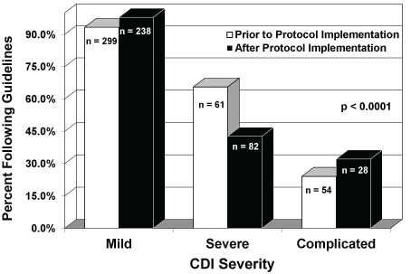 Eighty percent of patients were treated in accordance with guidelines prior to and post hospital protocol implementation. Patients treated according to the hospital protocol had a reduced mortality (4.0%) compared to patients treated according to Infectious Disease Society of America (IDSA) guidelines prior to protocol implementation (7.8%, p = 0.0471) and patients not treated according to the hospital protocol after implementation (11.3%, p = 0.0158). As CDI complexity increased, patients were less likely to be treated in accordance with either the IDSA guidelines or the hospital protocol (p < 0.0001) and had a higher rate of total complications and mortality.