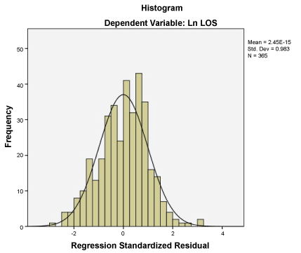 In the multi-variable analysis, multiple linear regression stepwise forward likelihood method was used. The dependent variable was the total LOS (in days). The independent variables were the variables whose P-value < 0.2 in the bivariate analysis after checking their adequacy for the model (ANOVA test of the last step was significant p < 0.001).