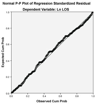 Twelve models were proceeded, so 11 independent variables were kept in the final model with exclusion of the variable of interest (IPC measures). Therefore, the variable of interest was forced back along with the 11 independent variables, selected by the previous model, using the enter method. The final model of the 12 independent variables was not perfect as it didn't show normality and homoscedasticity on the histogram and dispersion diagram, so a logarithmic calculation of the total LOS was performed and replaced as the dependent variable of the model. Accordingly, the normality and homoscedasticity was shown on the histogram, normal P-P plot and dispersion graph (as presented in the Supplementary Figure 1, Supplementary Figure 2 and Supplementary Figure 3). Adjusted R square was > 0.1 (0.354), global test (ANOVA) of the model was significant (p < 0.001), and all variance inflation factors (VIF) were < 10, so no collinearity was found.