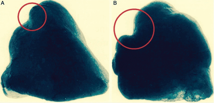 When the height to based ratio exceeds 1.42, the circumferential stress becomes negative and instead of containing the lung, it promotes an external traction force, that combined with the high negative pleural pressure present at the apex of between -15 to -20 cm H2O [5], causes an instability at the shoulder area of the prolate spheroid. This may result in tearing as the pressure vessel pulls apart. Thinning of the pleura with porosity may also occur [23]. The tearing or buckling effect results in repair by scarring and fibrosis with repeated cycles of damage and repair that may promote cavity formation [11]. The negative curvature of the rib grooves further aggravates the issue, resulting in the reversal of the normal surface loads (circumferential stresses), leading to tearing in the shoulder areas. The area most at risk is the posterior aspect of the apex where the first rib furrow is most prominent.