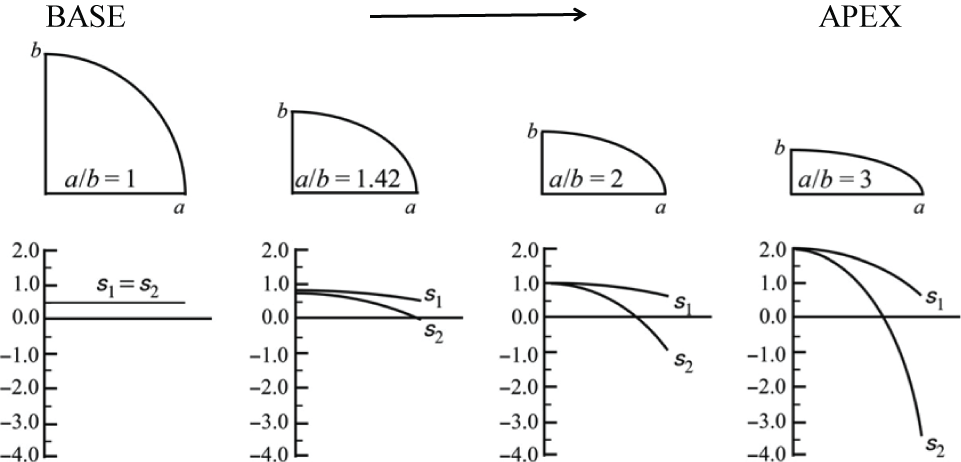 Figure 3 shows the ratios of stress in spheres and in ellipsoids with varying ratios of major-to-minor (a/b) axes where S1 is the axial stress and S2 is the circumferential stress. When the ratio of the height to the base of the apex protruding beyond the first rib reaches 1.42, the circumferential stress component becomes zero.