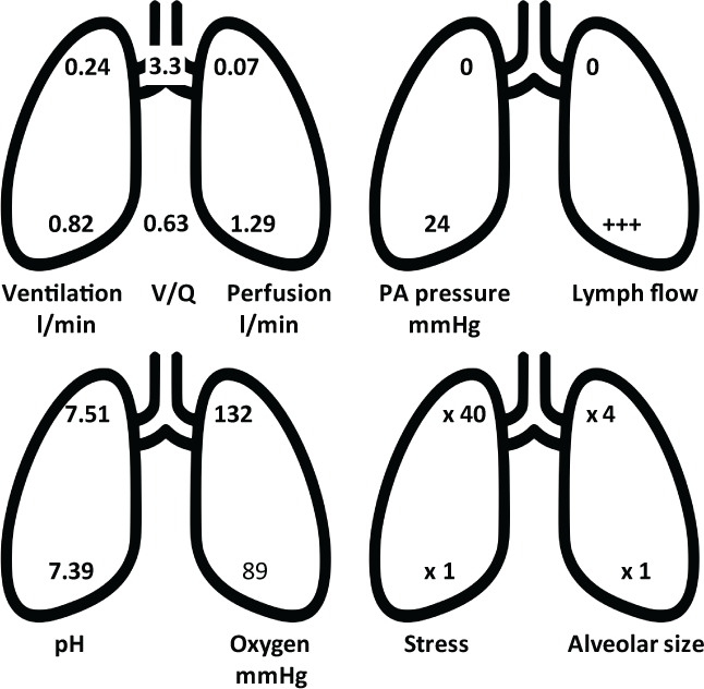 Figure 5: Regional differences in the normal lung, showing apical and basal values for ventilation, ventilation-perfusion ratios (V/Q), perfusion, pulmonary artery (PA) pressure, lymph flow, hydrogen concentration as pH, partial pressure of oxygen, pleural stress and alveolar size. Based on Casha [9], West [47] and Gurney [13].