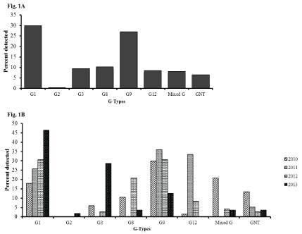 Figure 1: Rotavirus G types among children less than 5 years of age with acute gastroenteritis in Siaya, Western Kenya (2010-2013): Stool samples were stratified by year and using simple random selection, 234 of 401 rotavirus EIA positive specimens were selected and analyzed for genes specifying G and P genotypes. Figure 1A shows the overall percentage of the G-types. Figure 1B shows their distribution by year.