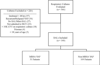 BAL: Bronchial alveolar lavage; CFU: Colony forming units; MRSA: Methicillin-resistant Staphylococcus aureus; SICU: Surgical intensive care unit; VAP: Ventilator-associated pneumonia.