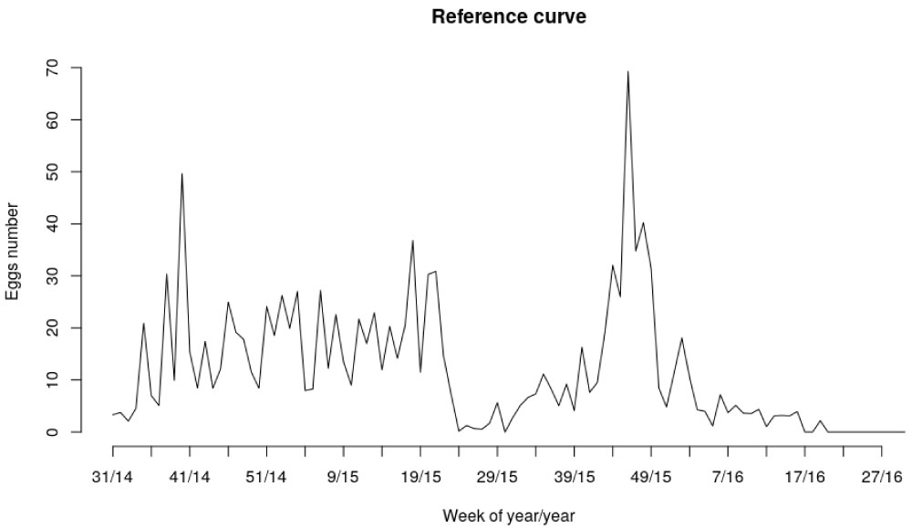 In our case study, each oviposition curve (corresponding to a single ovitrap site) was compared to the average time evolution of oviposition of all households taken as a reference. The reference curve is displayed in Figure 2.