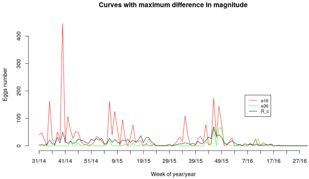 Figure 3: Curves with maximum difference in magnitude (curves of ovitraps e16 and e36). The reference curve (Rc) is also shown.